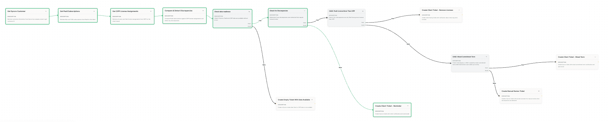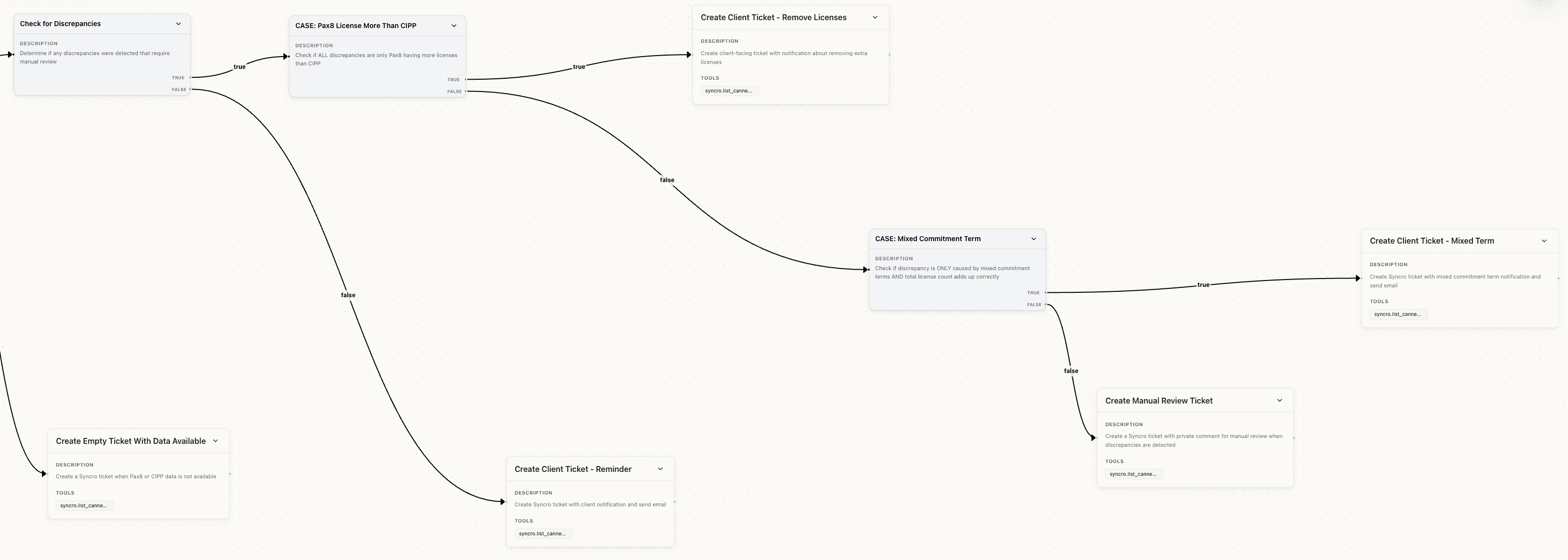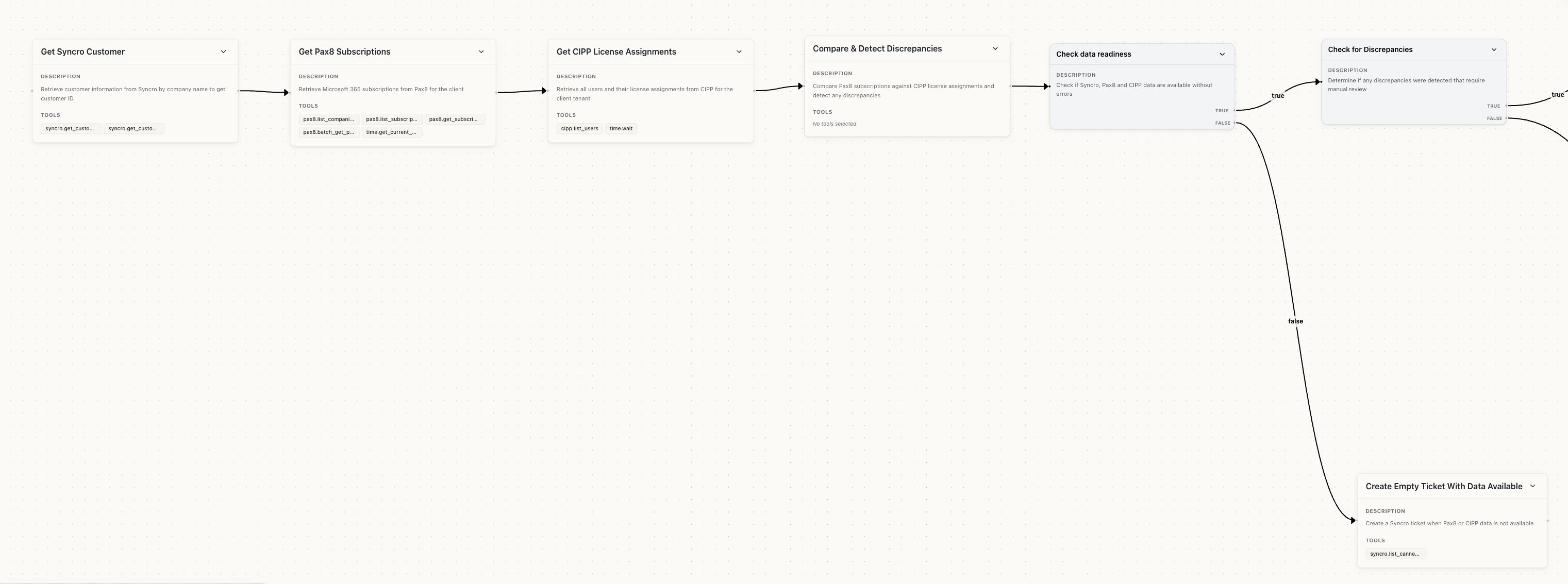 We also added tools to pull specific Pax8 product names and modified the logic to ignore noise: "Do not process subscriptions whose renewal date is more than 2 months away." We even added a conditional node to create a ticket for a human to clean up data when it couldn't be matched automatically.
